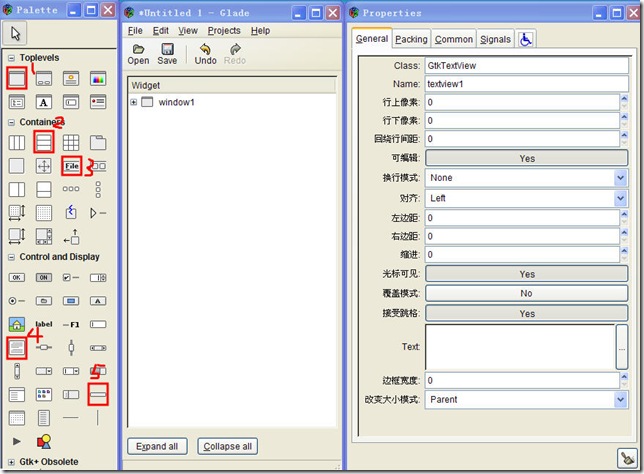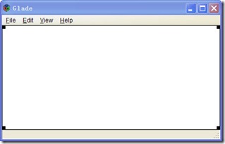现在开始创建一个类似于文本编辑器的图形界面.按照上图标注的顺序,依次添加window部件,vertical box部件,menu bar部件,text view部件和Status部件.vertical box设置三行,它是用来进行界面布局,分割空间用,这是gtk+设计与传统的windows UI设计很不同的地方.后三个部件是放置vertical box中的,最后设计完成图形如下.保存取名为win.glade.如果你感兴趣的话,可以用文件编辑器打开这个文件看看,正如所说的那样,它是一个xml格式的文本文件.