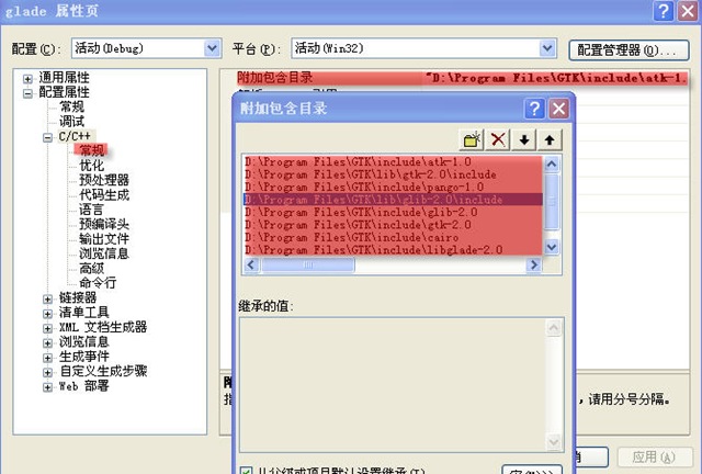 现在麻烦的事情到了,设置相关的头文件和库文件.设置头文件,右键点击项目名,然后选择属性.然后在"常规"-“附加包含目录"中设置你安装gtk+-win32-devel时对应的头文件目录.然后再设置库文件,需要gtk-win32-2.0.lib,glib-2.0.lib,gobject-2.0.lib.